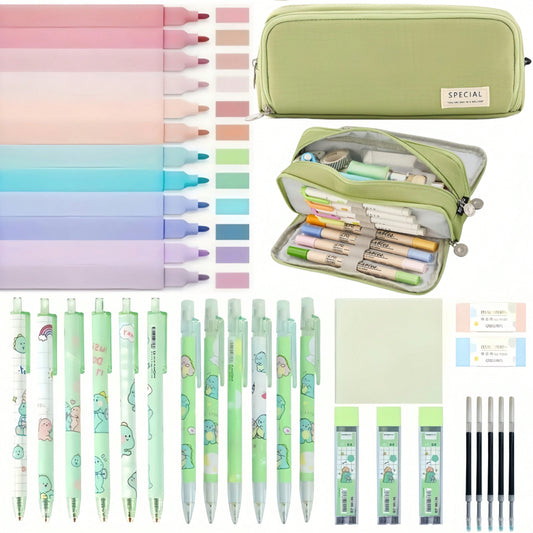 36 pezzi di simpatici articoli per la scuola con astuccio carino, 12 evidenziatori pastello, 6 penne gel inchiostro nero, 6 matite meccaniche kawaii da 0,5 mm, set per studenti, articoli di cartoleria, essenziali per il college, forniture scolastiche