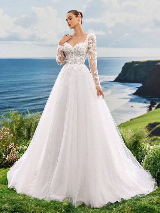 Abito da sposa lungo con maniche lunghe, collo a forma di cuore in pizzo ricamato con perle, corpetto in rete a forma di A con strascico, di lusso, elegante e romantico
