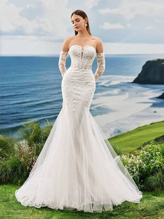 Abito da sposa lungo con strascico, senza spalline, in pizzo ricamato con perle, stile sirena, maniche lunghe, elegante e romantico, adatto per matrimoni
