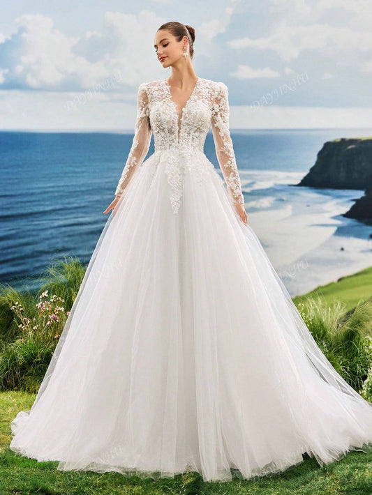 Abito da sposa in in rete a lun ghe maniche con scollo a V, decorato con ricamo di perle e pizzo, elegante e romantico, adatto per cerimonie in chiesa