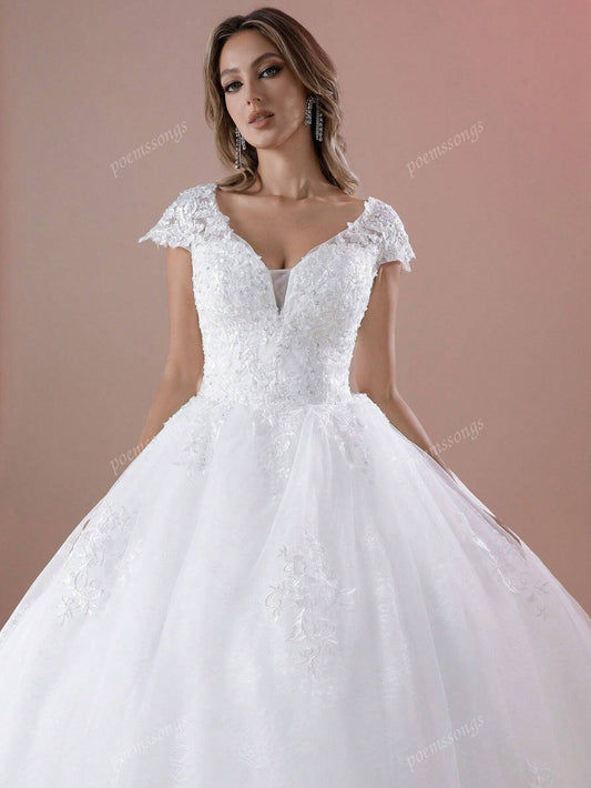 Elegante abito da sposa con maniche a cappuccio, scollo a V, decorato con perline e applicazioni, a palloncino (il copripettorina non è incluso), per la sposa