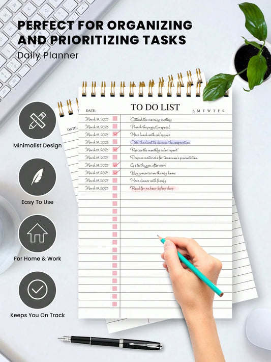 Pianificatore giornaliero minimalista con lista delle cose da fare, + 3 adesivi, quaderno a spirale non datato formato A5 con layout semplice a caselle di controllo, tracker settimanale e sezione per la data, ideale per scuola