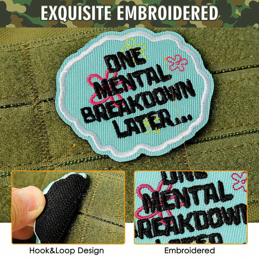 • pezzo toppe da 6cmLx5.2cmL con scritta "One Mental Breakdown Later", toppe ricamato con humor sarcastico, badge con per zaini, imbracature per cani, gilet, borse da palestra, cappelli, caschi, regalo ideale
