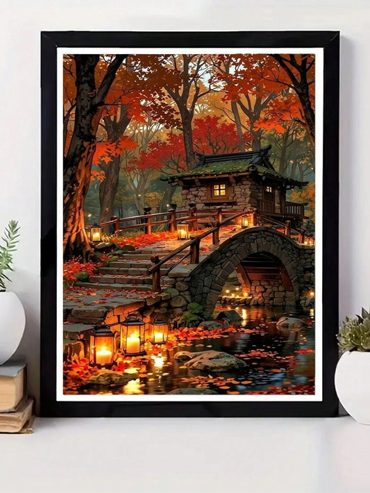 Set 30x40cm Dipinto di diamanti autunnale senza cornice, riproduzione precisa della texture di foglie d'acero, alone luminoso di lanterne, texture di ruscelli limpidi, decorazione da camera da letto, artigianato fai-da-te facile
