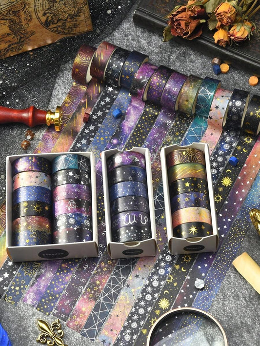 Nastro washi decorativo con cielo stellato bronzato e argentato, tema universo e pianeti, per DIY, decorazioni, diari, scrapbooking