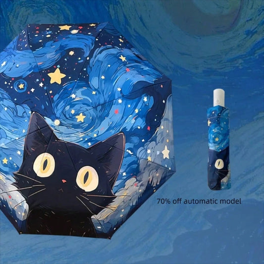1 pezzo Nuovo, carino, ombrello pieghevole con motivo a gatto di Van Gogh, ombrello reversibile da sole e antipioggia, automatico, con protezione UV, modello di gatto nero alla moda